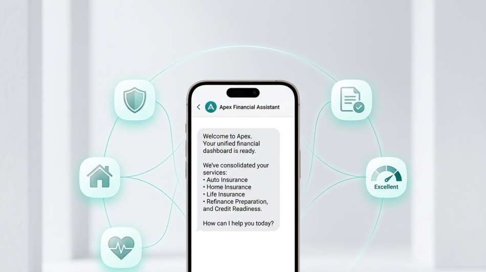 Apex introduces a consolidated, text‑interactive financial system that replaces the need to contact multiple companies-giving customers instant access to auto, home, insurance, credit, and protection services in one place.