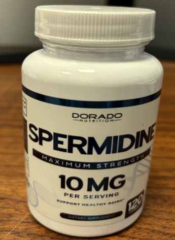 The Dorado Nutrition brand Spermidine Maximum Strength 10mg per serving is packaged in a white capsule bottle containing 120 capsules. The product is labeled with a blue outlined label, with a best by date of 04/2026 located on the bottom of the bottle, with Lot Number 12792402-44 and 12792402-44J. No allergic or adverse reactions have been reported to date.