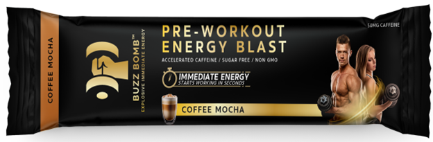 BUZZ BOMB™, featuring 50mg of caffeine and offered in four flavors (Tropical Fruit, Mixed Berry, Peach Mango, and Coffee Mocha), provides nearly instant energy, in easy-to-use small sublingual packets, which can be taken right before and during work out as needed. Unlike most pre-workout products that are mixed with water and taken well before a workout, BUZZ BOMB™ is sprinkled under the tongue right before or during a workout for immediate effect via direct delivery to the bloodstream.
