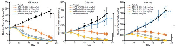 In preclinical PDX models, which use human tumor tissues to mirror real-world genetic complexity, MTX240 demonstrated dose-dependent efficacy in shrinking GIST in both non-resistant (left hand chart) and TKI-resistant tumors (middle and right hand chart) as illustrated below [3]: