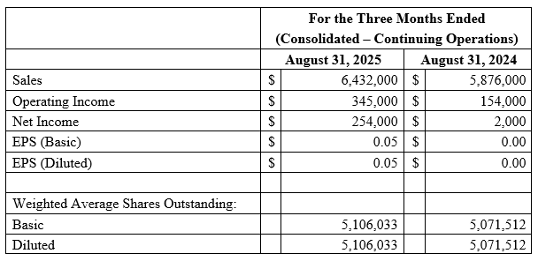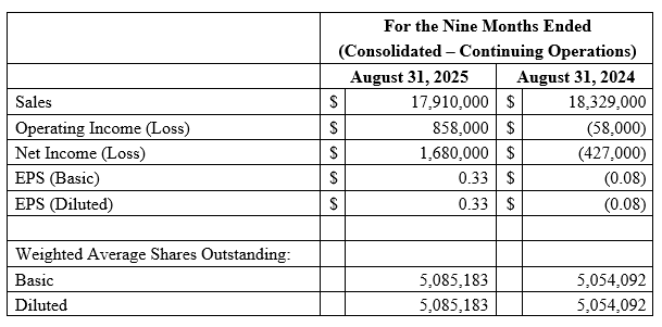 Sales of $6,432,000 for Q3 of fiscal 2025, a 9.5% increase from Q3 2024, and sales of $17,910,000 for the nine months ended August 31, 2025, a 2.3% decline from the same period of 2024.