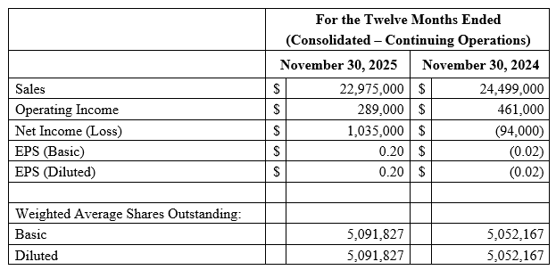 Net income from continuing operations of $1,035,000 for fiscal 2025 compared to net loss from continuing operations of $94,000 in fiscal 2024. We received an Employee Retention Credit refund in fiscal 2025 that positively impacted net income from continuing operations by $1,052,000.
