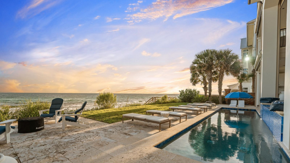 Evening light drapes across the terrace at 756 Blue Mountain Beach Road, where the Gulf meets the edge of a private pool-proof that some homes don't just face the water; they belong to it.