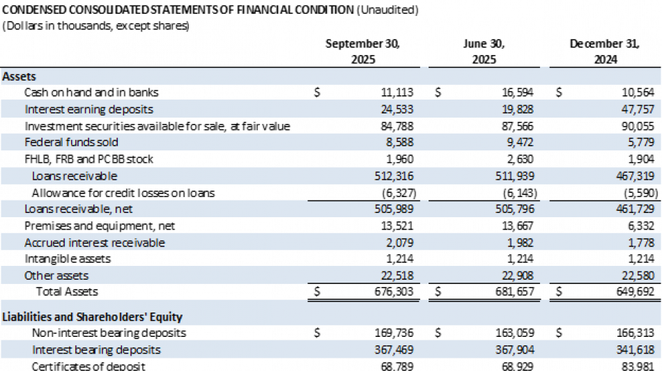 Total assets decreased $5.4 million to $676.3 million at September 30, 2025 from $681.7 million at June 30, 2025.