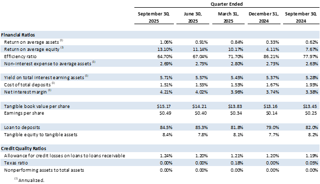 Total non-interest expense increased $240,000, or 5.4%, during the third quarter of 2025 compared to the second quarter of 2025 due primarily to an increase in compensation and employee benefits related to an increase in full-time equivalents and incentive compensation accrual.
