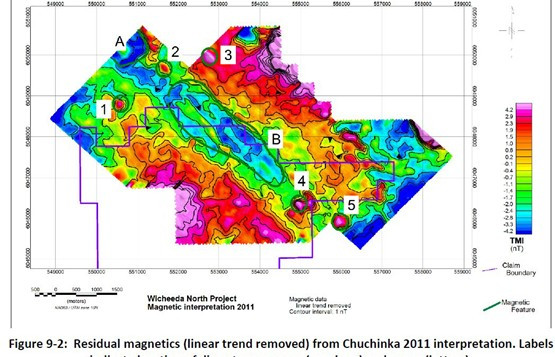 Figure 3: Second Vertical Derivative of the Residual Magnetics (linear trend removed) from Chuchinka 2011 Interpretation. Labels indicate location of discrete responses (numbers) and zones (letters)