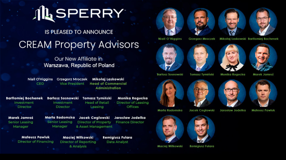 Niall O'Higgins, CEO and Founder of CREAM Property Advisors, added: "Joining the SPERRY Global Network allows us to maintain our independence and identity while expanding our international reach. Our clients gain access to SPERRY's global relationships, technology, and cross-border platform - and SPERRY gains a partner with deep local insight and a proven record of performance across Poland's commercial sectors."
