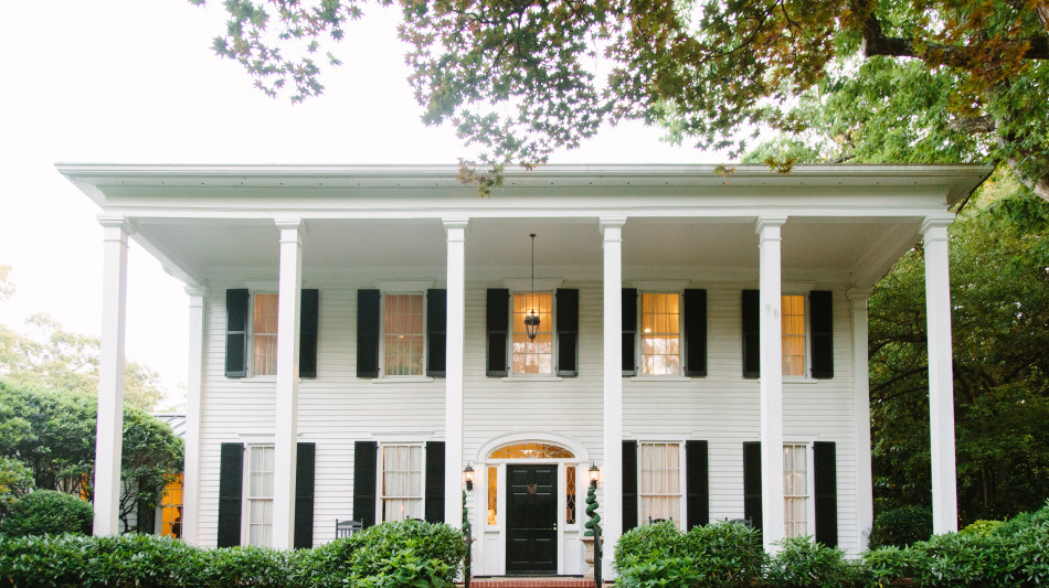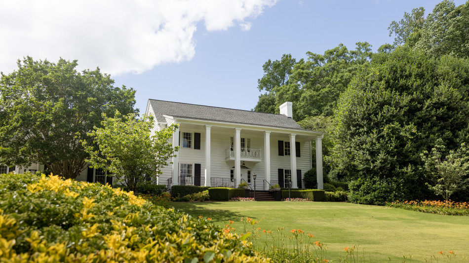 Flint Hill (Norcross, GA): A charming historic home set on a tranquil lawn, featuring a courtyard, covered pavilion, gardens, dressing suites, and a grand ballroom, offering options for indoor or outdoor celebrations any time of year.