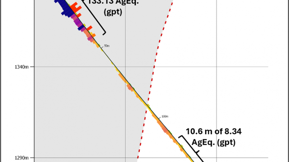 152.4 meters averaging 36.32 gpt AgEq (0.236 gpt Au, 19.81 gpt Ag), from the collar including 10.6 meters of 212.35 gpt AgEq (81.41 gpt Ag, 1.871 gpt Au) and 4.6 meters of 176.57 gpt AgEq (92.8 gpt Ag, 1.197 gpt Au)