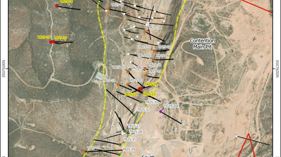 Hole TR25-26 - Collared as a northerly offset to TR25-17 in the center of the northern Contention mine area. It intersected 48.6 meters of 133.1 gpt AgEq (58.93 gpt Ag, 1.06 gpt Au) from surface. It also intersected at depth 10.6 m (130.7 - 141.3 m) with 8.34 gpt AgEq (4.06 gpt Ag, 0.061 gpt Au). The drillhole leaves the mineralization open to depth and to the east.