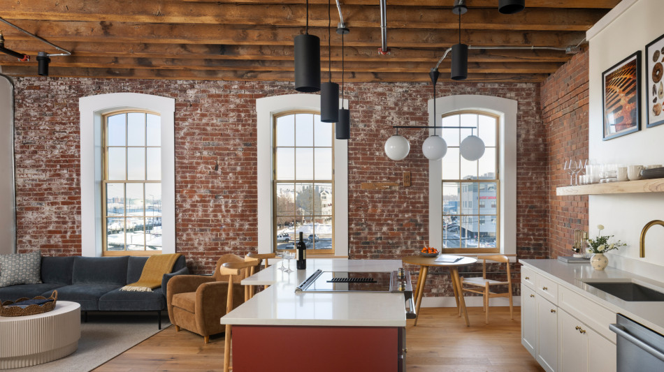 Named after one of the building's earliest owners, Evalina Fox, the Evalina Hotel honors Portland's maritime past while offering contemporary comfort and craftsmanship. Each suite reflects a thoughtful balance of old and new, masculine and feminine: exposed masonry and original granite lintels pair beautifully with custom cabinetry, decorative lighting, and soft, modern furnishings.