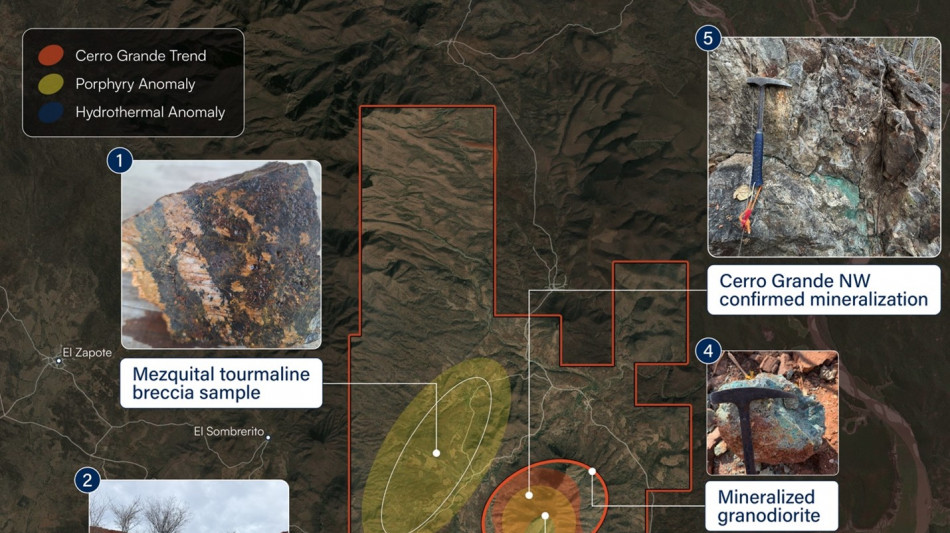 The campaign confirmed copper-gold-silver mineralization across multiple target areas, including Potrero South, Las Trancas, Cerro Grande Northwest, La Molina and Mezquital, and led to the discovery of a new skarn zone at Potrero South target, located approximately 3 km south of the Cerro Grande central discovery, with over 300 metres of surface exposure and samples exceeding 3% Cu. Additionally, the program successfully confirmed mineralization at targets generated through the Company's machine learning exploration program, including the emerging La Molina target.