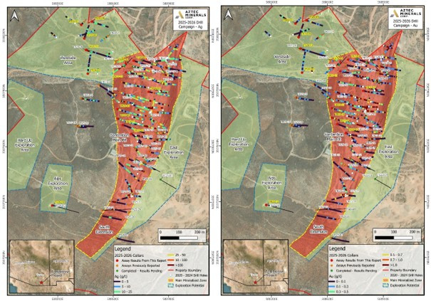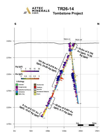 VANCOUVER, BC / ACCESS Newswire / April 15, 2026 / Aztec Minerals Corp. (TSXV:AZT)(OTCQB:AZZTF) ("Aztec" or the "Company") announces the results from 14 drill holes from its reverse circulation ("RC") portion of the 2025-2026 drilling program at the Tombstone Property in Southeastern Arizona. Step out drilling in the Westside target area of the property has discovered additional strong, wide, shallow oxide gold-silver intersections. The mineralized zone has been further extended to 0.4km of width into the Westside area, with the Contention Au/Ag zone from the northern property limit to over 1km N-S on strike. Pending drill results include additional Westside area drill targets as well as several step out targets drilled in the immediate, westerly and deeper extensions of the Main Contention zone. The 17,000m 2025-2026 drilling program has now completed 59 RC and 6 core drill holes.