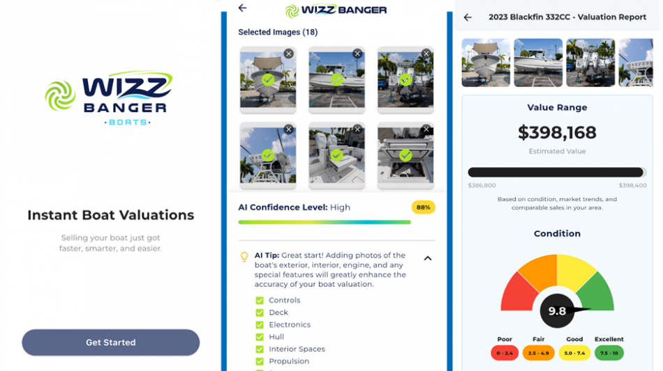 Once the Wizz Banger Valuator generates its condition score, the platform merges that data with a comprehensive analytics stack incorporating national and regional listing data, recent comparable sales, historical sales records, depreciation and seasonality trends, regional pricing patterns, demand fluctuations, and model-specific desirability trends. The result is a true third-party valuation-a blend of objective condition analysis and real-world market data, free from OEM influence or subjective guesswork. With the Wizz Banger Valuator, Twin Vee believes that the marine industry now has a scalable technology capable of producing consistent, automated valuations across all brands and models. Only engine hours and internal mechanical conditions require manual confirmation from the seller or dealer.