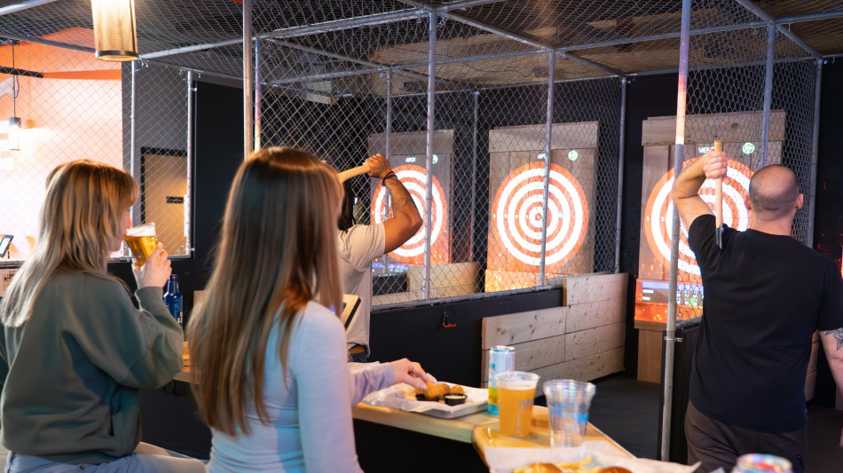 Apex Axes is designed for guests ages 16 and up and caters to a wide range of audiences, including date nights, friend groups, and corporate events. The space can accommodate everything from small gatherings to groups of 40-70 people, offering a new option for companies seeking team-building or holiday celebrations.