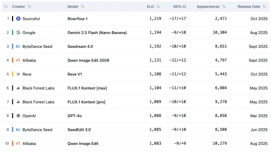 In benchmark testing conducted by Artificial Analysis, Riverflow achieved state-of-the-art performance, ranking number one globally for image editing and outperforming leading models across a wide range of tasks.