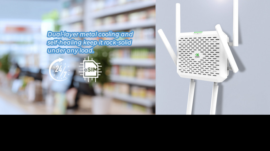 The FWA12 supports wired broadband and 5G cellular with flexible WAN/LAN/VLAN roles, allowing it to can operate as a 5G primary, backup or hybrid gateway. Load-balancing, traffic policies and IP Passthrough cover typical deployment needs, while automatic failover plus dual SIM and eSIM redundancy help keep sites online. Robust thermal design with fault detection and self-healing further enhances long-term stability.