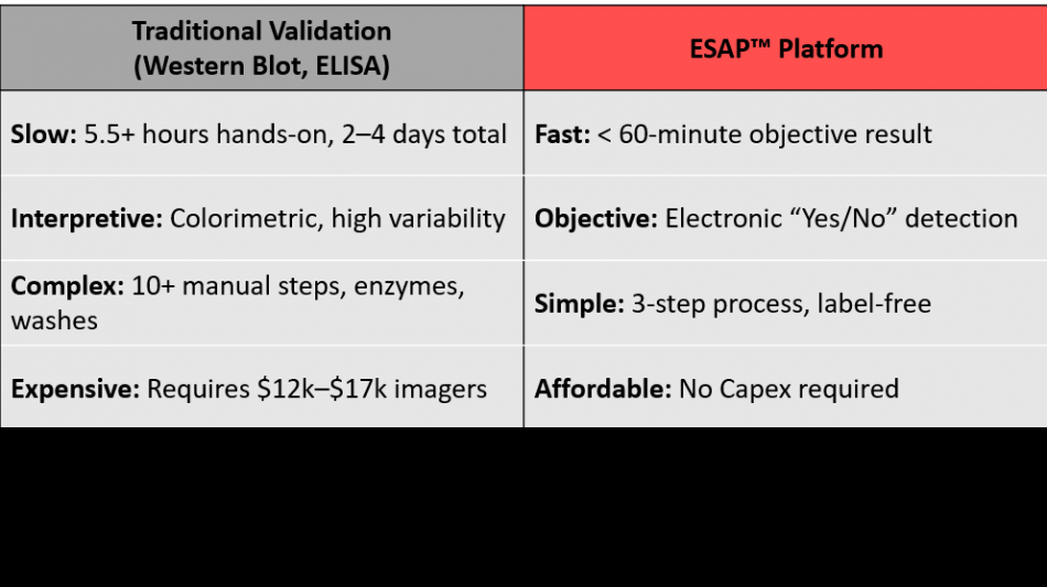 Current validation workflows (western blot, ELISA) rely on slow, interpretive colorimetric measurements. ESAP™ addresses these barriers by introducing a graphene-based electronic approach that is fast, objective, and affordable: