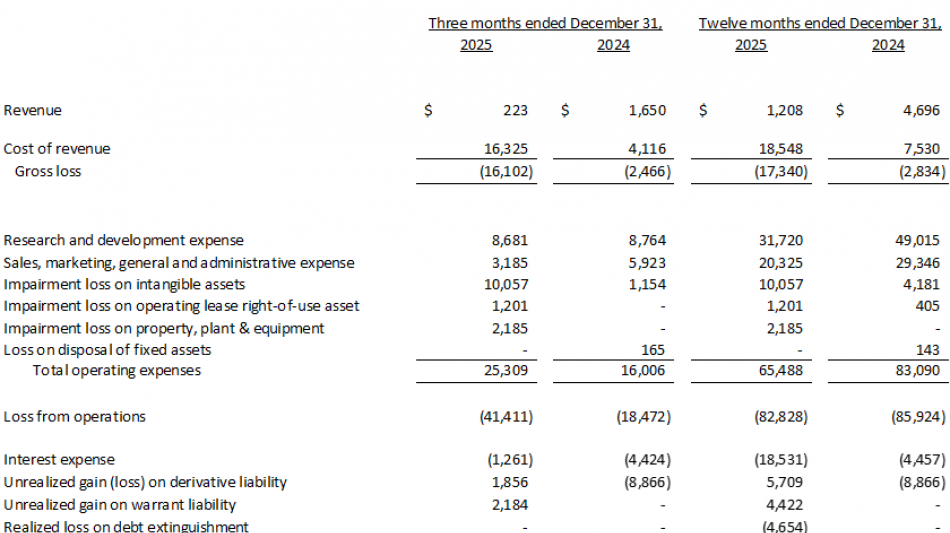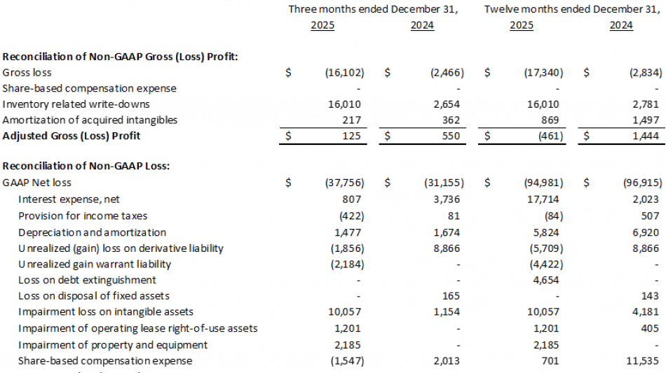 Net loss for the fourth quarter of 2025 was $37.8 million, or $0.12 per share, which includes $29.4 million of non-cash charges related to asset impairment and inventory write-downs partially offset by a net credit of $1.5 million of non-cash, share-based compensation expense, compared to a net loss of $31.2 million, or $0.14 per share, which includes $1.9 million of non-cash charges related to inventory write-downs and $2.0 million of non-cash, share-based compensation expense, for the fourth quarter of 2024.