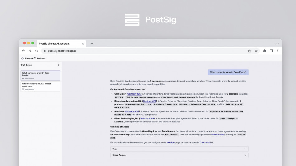 "Organizations already know the answers are somewhere in their documents. They just spend an enormous amount of time hunting for them, reconciling them, and figuring out what actually applies today," said Hendrik Bartel, CEO and co-founder of PostSig. "LineageAI understands how agreements, amendments, and related records change over time. The Assistant makes that intelligence immediately accessible, so teams can move from searching to deciding in seconds."