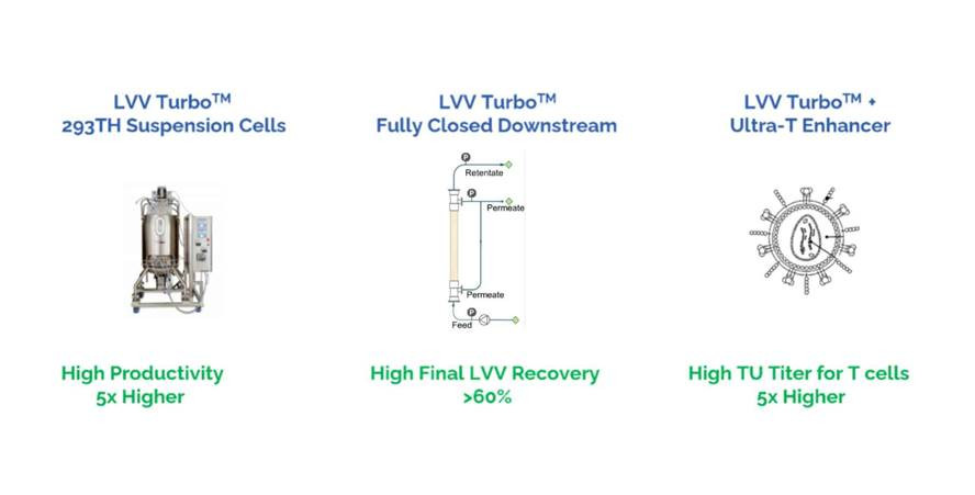 Our LVV Turbo™ platform integrates three cutting-edge technologies - our high-productivity 293TH suspension cell line, a fully closed downstream purification process, and the partnered Ultra-T enhancer - to deliver higher yield, higher potency, and lower cost.