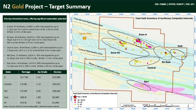 Formation Metals Inc. is a North American mineral acquisition and exploration company focused on the development of quality properties that are drill-ready with high-upside and expansion potential. Formation's flagship asset is the N2 Gold Project, an advanced gold project with a global historic resource of ~870,000 ounces (18 Mt grading 1.4 g/t Au (~809,000 oz Au) across four zones (A, East, RJ-East, and Central)2,3 and 243 Kt grading 7.82 g/t Au (~61,000 oz Au) across the RJ zone2,4) and six mineralized zones, each open for expansion along strike and at depth including the "A" zone, of which only ~35% of strike has been drilled (>3.1 km open), and the "RJ" zone, host to historical high-grade intercepts as high as 51 g/t Au over 0.8 metres.
