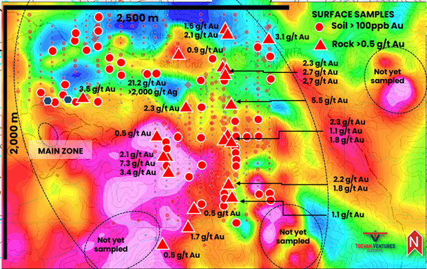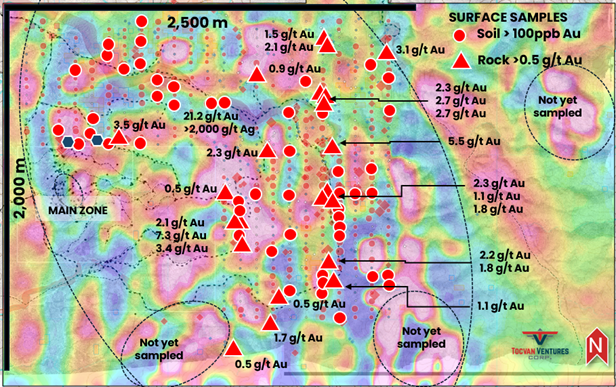 Soil samples up to 21.2 g/t Au and >2,000 g/t