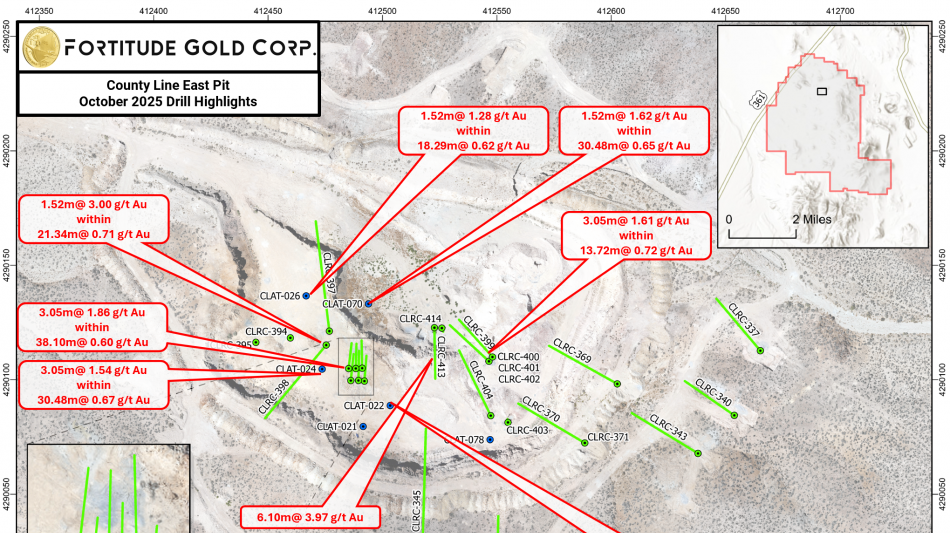 COLORADO SPRINGS, COLORADO / ACCESS Newswire / October 8, 2025 / Fortitude Gold Corp. (OTCQB:FTCO) (the "Company") announced multiple oxide gold drill intercepts at and near surface at the historic East Pit located on the County Line Property. Intercepts include 33.53 meters grading 0.75 grams per tonne (g/t) gold and 6.10 meters grading 3.97 g/t gold. Fortitude Gold is a gold producer, developer, and explorer with operations in Nevada, U.S.A. offering investors exposure to both gold production and dividend yield.