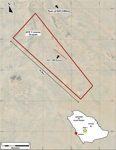 Afif 1 (76 km²) -Discontinuous 2 km long by up to 250 m wide, north-northwest oriented VMS gossan and associated hydrothermal alteration (Figure 5).