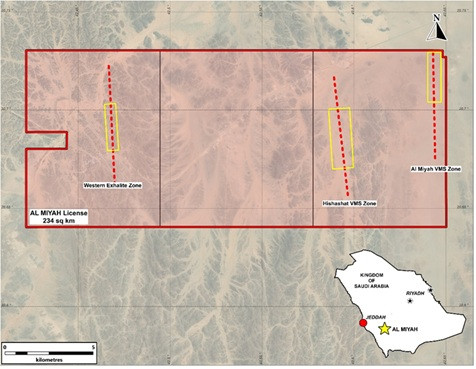 Al Miyah (234 km²) - Three licenses covering several sub-parallel VMS prospects with evidence of ancient mining (Figure 3).