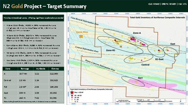 Formation Metals Inc. is a North American mineral acquisition and exploration company focused on the development of quality properties that are drill-ready with high-upside and expansion potential. Formation's flagship asset is the N2 Gold Project, an advanced gold project with a global historic resource of ~870,000 ounces (18 Mt grading 1.4 g/t Au (~809,000 oz Au) across four zones (A, East, RJ-East, and Central)2,3 and 243 Kt grading 7.82 g/t Au (~61,000 oz Au) across the RJ zone2,4) and six mineralized zones, each open for expansion along strike and at depth including the "A" zone, of which only ~35% of strike has been drilled (>3.1 km open), and the "RJ" zone, host to historical high-grade intercepts as high as 51 g/t Au over 0.8 metres.