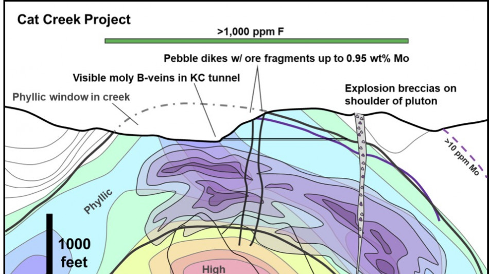 In addition to the Cat Creek's molybdenum potential, this system appears to be exceptionally well endowed with rhenium. Virtually all worldwide rhenium production comes as a by-product of molybdenum mines. Sampling to date indicates that molybdenum-rich rocks at surface are also rhenium enriched, averaging approximately 30 gpt Re, versus average Re grades of approximately 0.5 gpt Re for most molybdenum mines (normalized to a 0.10% Mo grade)."