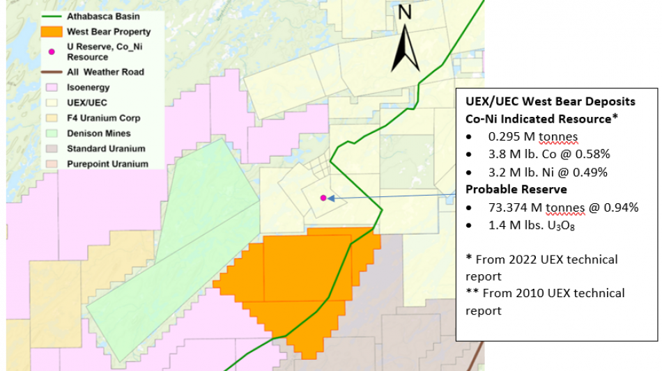 West Bear is located approximately 35 km southeast of the Cigar Lake uranium mine, and 50 km south of the McClean Lake uranium mill. The West Bear uranium and cobalt-nickel deposits held by Uranium Energy Corp. ("UEX/UEC") are located just north of the property (Figure 1 below). The unconformity between the Athabasca Basin sandstone and the underlying basement rocks crosses the western portion of the property (Figure 1). West Bear saw significant uranium exploration activity between the 1960s and 2015, with a total of 15 exploration holes being drilled, including three by Denison in 2015. Historical exploration data evaluated by the Company includes high-resolution electromagnetic airborne geophysical surveys. In 2022 North Shore completed a gravity-magnetic-radiometric airborne survey over West Bear. The Company has selected several targets that warrant further exploration and evaluation of all exploration data is ongoing.