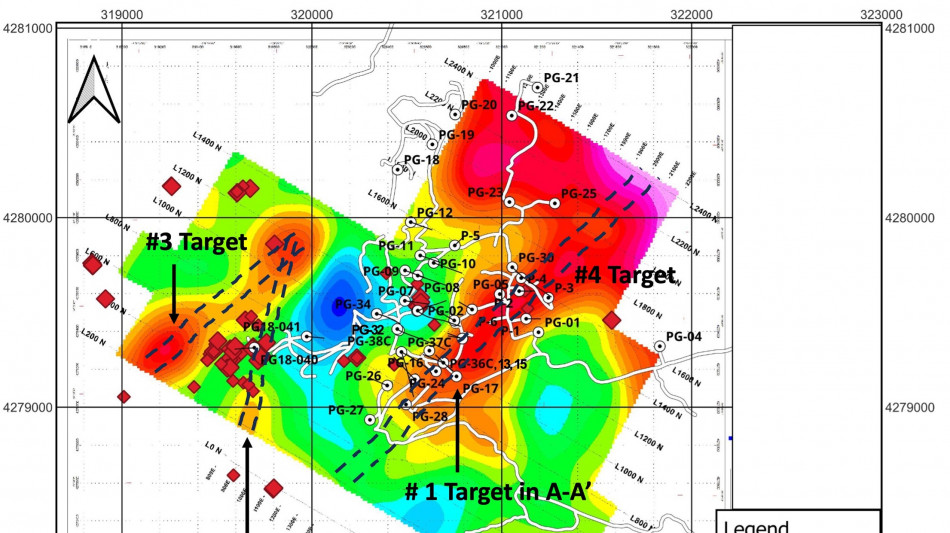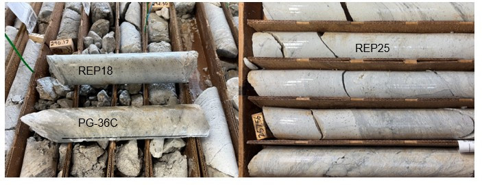 A third hole REP25, was drilled at an inclination below Target Hill (#4 Target on Figure 2) to a hole depth of 572 metres, and is located at the NE end of the 1.7km structural corridor that includes altered rhyolites. Target Hill is a highly altered rhyolite dome that had been previously returned 315.5 metres of 0.1 g/t AuEq (see Figure 5). Although PG30 is subeconomic in grade, the presence of gold and the significant degree of alteration near surface are strong indicators of the potential for higher grades at depth. Hole REP25 primarily intersected altered flow-banded rhyolite throughout the hole, including varying amounts of sulphides and alteration that is comparable but not identical to holes REP18 and REP22. Further drill testing will depend on the pending assay results.