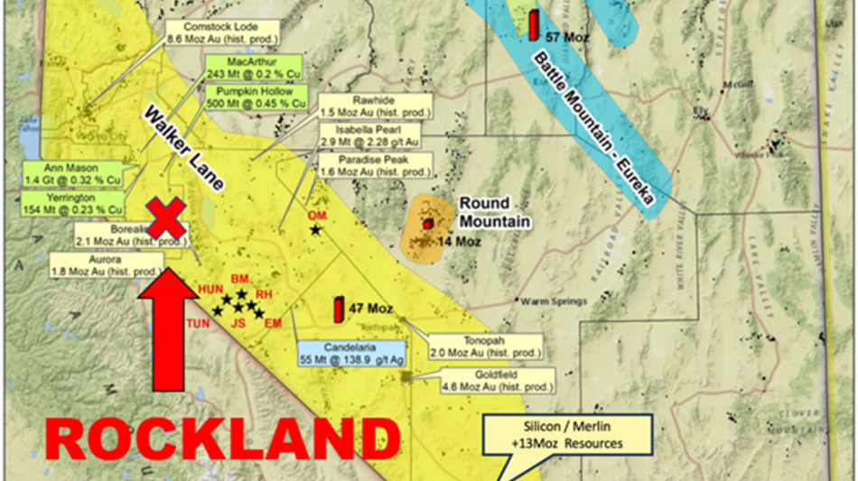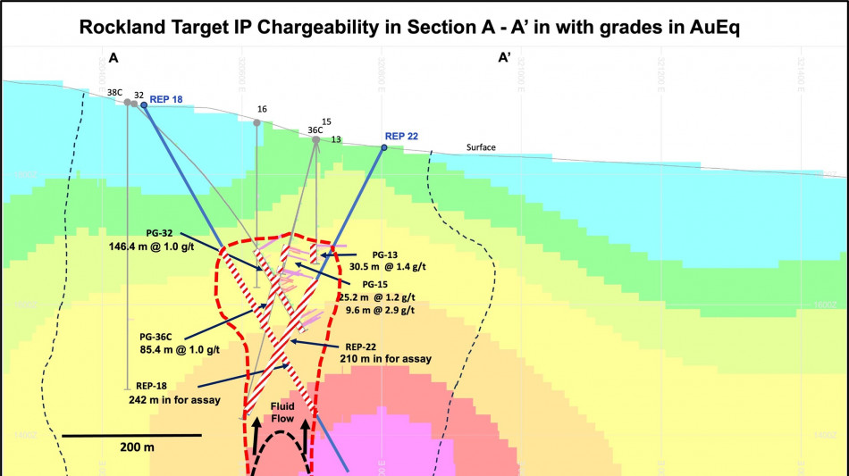 TORONTO, ON / ACCESS Newswire / October 27, 2025 / Wolfden Resources Corporation (WLF.V) ("Wolfden"or the"Company") is pleased to announce that it has completed the first three core holes totalling approximately 1,600 metres at its Rockland Gold Project located in the Walker Lane Trend of Nevada, USA. The program is designed to test below significant historical drill results that ended in mineralization, including 146.4 metres at 1.0 g/t AuEq* in hole PG-32 and 85.4 metres at 1.0 g/t AuEq* in hole PG-36C. The first hole of the program REP18, was drilled below hole PG-32 with a steeper inclination to test the extent and potential continuation of the wide mineralized zone past the end of hole PG-32 that stopped short in mineralization. The second hole REP22, was drilled in an opposing direction to REP18 and PG-32 in order to cut back across the mineralized zone to better determine the size and orientation of the zone. As previously announced REP18 intersected 242 metres (from 282 to 524 metres down the hole) of the same intensely altered flow-banded rhyolite with similar levels of alteration and fine-grained sulphide content, that was intersected in the 85.4 metre mineralized section of hole PG-36C (see Figure 4). In addition, REP22 intersected 210 metres of the same flow-banded rhyolite with similar alteration and sulphides. The two opposing REP holes appear to indicate that the mineralized rhyolite is a steeply dipping volcanic conduit or dyke that expands into a mushroom shape closer to surface as it intruded the surrounding host rocks (see Figure 4). There appears to be two phases of intense alteration that includes adularite followed by a stronger illite overprint. The bottom 30 metres of the mineralized rhyolite in both REP holes display an increase in deformation and dark hairline fractures, that may also contain very fine grained sulphides. Although the visual results are positive, the Company is standing by for the assay results before continuing to test for higher grade mineralization at depth below both REP holes.