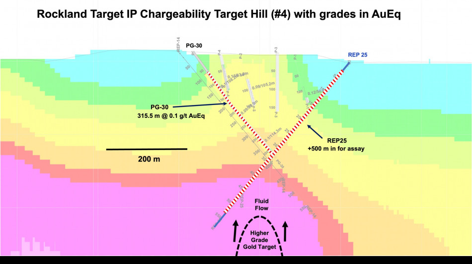Figure 5. Rockland Chargeability Cross Section of Target Hill (#4) showing REP25 and PG30
