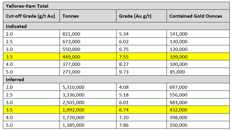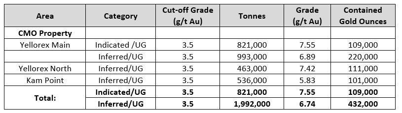 The Company's October 2022 MRE was based on a 3.50 g/t cutoff, (Refer to Oct. 21, 2022 Technical Report).The CMO Deposit MRE has been estimated at a range of cut-off grades and are presented in Table 14-11 in the Oct. 21, 2022 Technical Report, to demonstrate the sensitivity of the resource to cut-off grades. Values in this table are reported above and below the base case cut-off grade of 3.5 g/t Au and a gold price of US$ 1750 per ounce of gold. It may be possible to use a lower COG, such as 2.5 g/t for underground mining at current gold price, and the Company believes this potential will be tested in the planned exploration drilling at Yellorex and Yellorex North, and in-fill drilling to raise the confidence level of a future resource estimate.