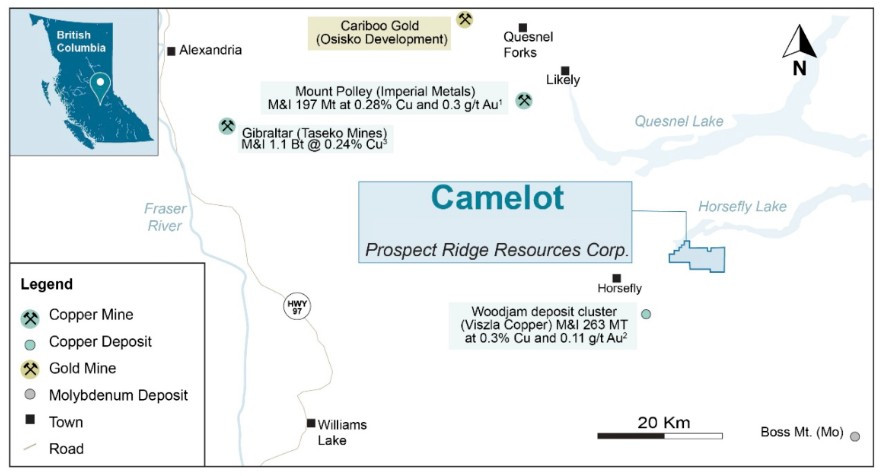 The 2,646-hectare Camelot property lies approximately 65 kilometres east of Williams Lake, B.C. within the Quesnel Terrane - home to multiple producing copper-gold and copper-molybdenum porphyry deposits, including the nearby Gibraltar and Mount Polley mines (Figure 1). The project area benefits from year-round road access and excellent regional infrastructure.