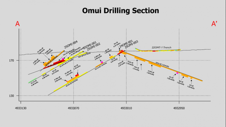 (Figure 1: Plan view showing drill traces with AuEq results at Omui. Holes reported on in this release are labeled with red lettering. Section A-A' is presented in Figure 2.)