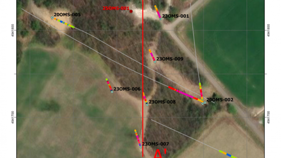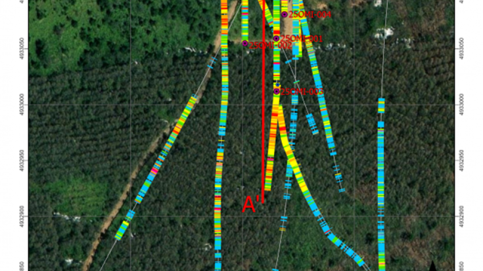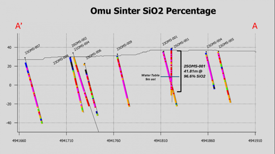 (Figure 3: Plan view of Omu Sinter showing drill traces with silica contents. Hole 25OMS-001, a subject of this news release, is labeled in red. Section A-A' is shown in Figures 4 and 5.)