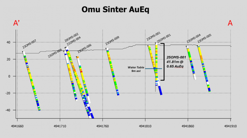 (Figure 4: Cross section showing drill traces at Omu Sinter with AuEq values, looking east. The significant precious metal interval in hole 25OMS-001 is highlighted with a label.)