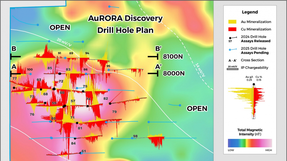Twenty-four drill holes (9,687 m) were completed at the AuRORA Deposit in 2025: 23 of these are expansion step-out holes drilled over an area of 1 km by 1 km (see Amarc release October 22, 2025). Assay results from six drill holes completed on Sections 8000N and 8100N announced today have successfully expanded AuRORA +200 m to the north (see Figures 1 to 3, and Tables 1 and 2). The deposit remains open to further expansion to the north, east and west of Section 8000N and 8100N, with assay data pending from additional 2025 drill holes located further to the north. This northern extension to the deposit is in addition to partial assay results from AuRORA hole JP25098 announced in September that expand the deposit approximately 300 m to the southeast. Host rocks, alteration and mineralization remain consistent with that encountered in the 2024 AuRORA discovery drill holes.