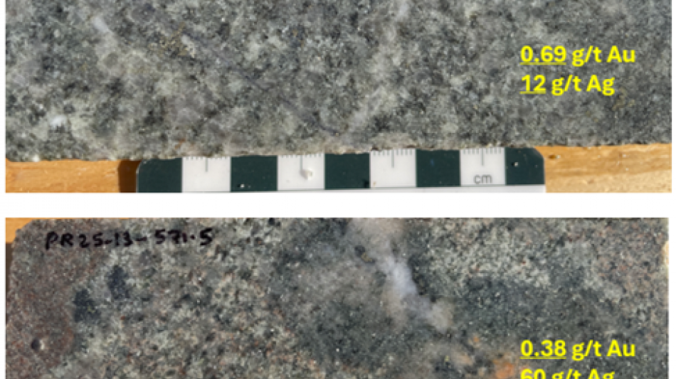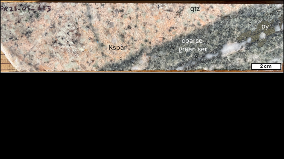 PR25-05 at 623 m - Quartz-monzonite with K-silicate alteration, overprinted by green sericite, and cut by quartz-pyrite veins. This sample represents gold-rich porphyry mineralization and grades 0.92 g/t Au and 6 g/t Ag (from a 2.8 m sample interval).