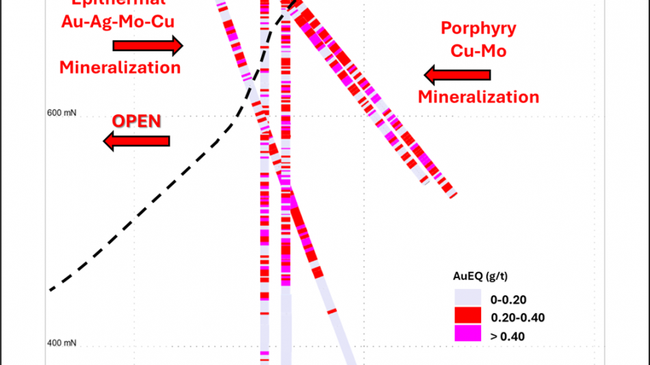 The quartz monzonite and the overlying volcanic rocks are affected by strong K-feldspar and biotite alteration, respectively. Both host rocks are cut by quartz Mo-Cu veins. This early porphyry-type Mo-Cu mineralization has been intersected in several drill holes located on the east and northeast of the "EYE". Notably, drilling has identified increasing Cu grades to the northeast, indicating a potential Porphyry Cu-Mo deposit target located northeast of the Prodigy "EYE" (see Table 5 and Figures 2, 5 and 6). Hole BD-11-70 intersected 151 m grading 0.12% Cu and 0.04% Mo, hole BD-11-68 intersected 107 m grading 0.10% Cu and 0.08% Mo, hole PR25-10 intersected 92 m grading 0.11% Cu and 0.04% Mo, and hole PR25-11 intersected 90 m of 0.16% Cu and 0.04% Mo.