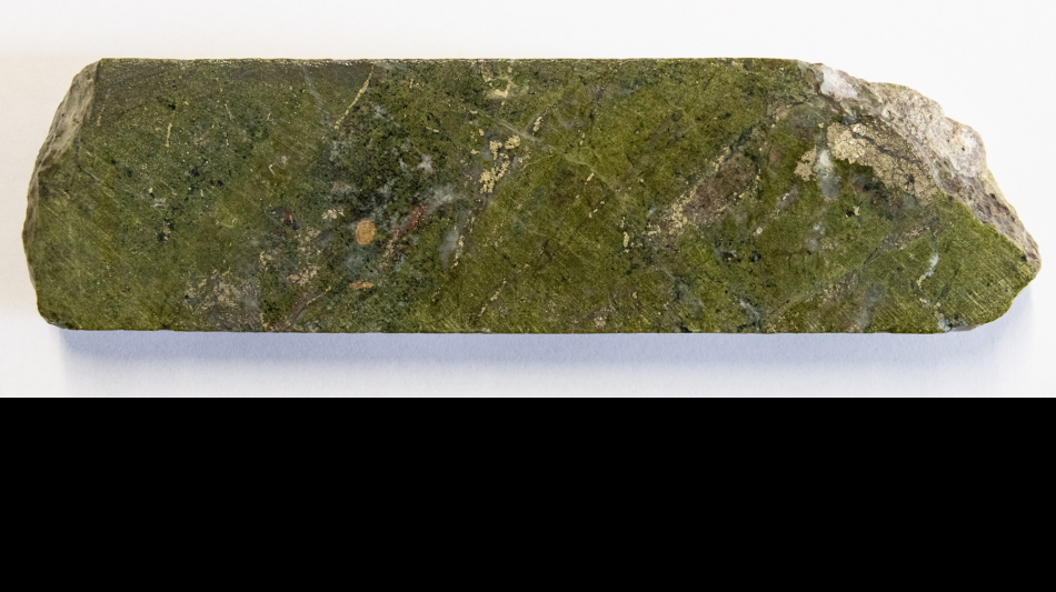 Chalcopyrite was observed in discrete intervals as quartz-epidote vein material and as semi-massive pyrrhotite-pyrite-chalcopyrite associated with shear zones (see figure 4).