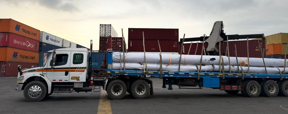 The earthworks are finished, and the installation of the drainage system is about to begin. The first shipment of geotextiles and geomembranes, purchased from China, has arrived in Peru and is being transported to the project site.