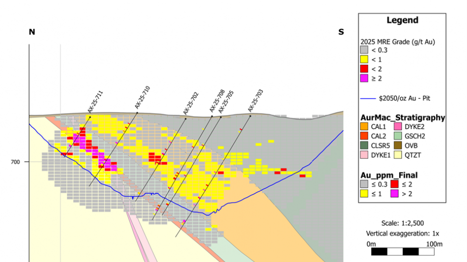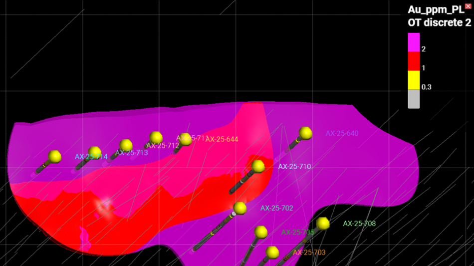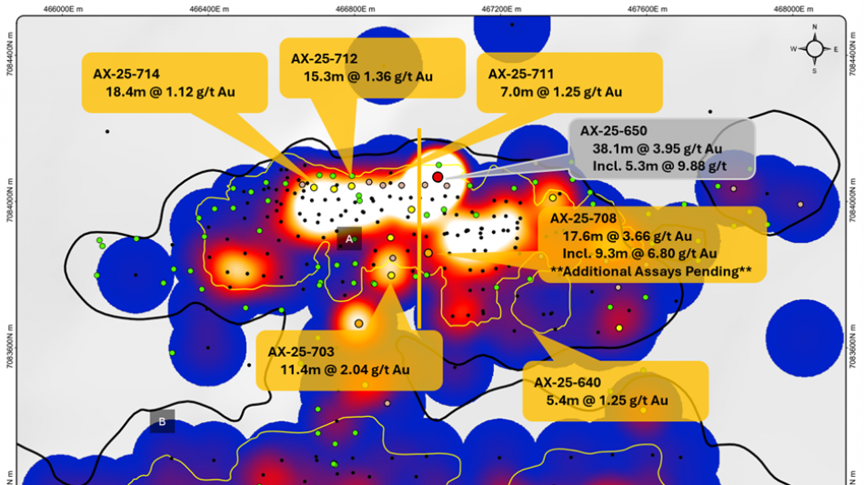 AX-25-708 - 3.66 g/t Au over 17.6 metres ("m"), including 6.80 g/t Au over 9.3m, with high-grade interval of 35.98 g/t Au over 1.6m