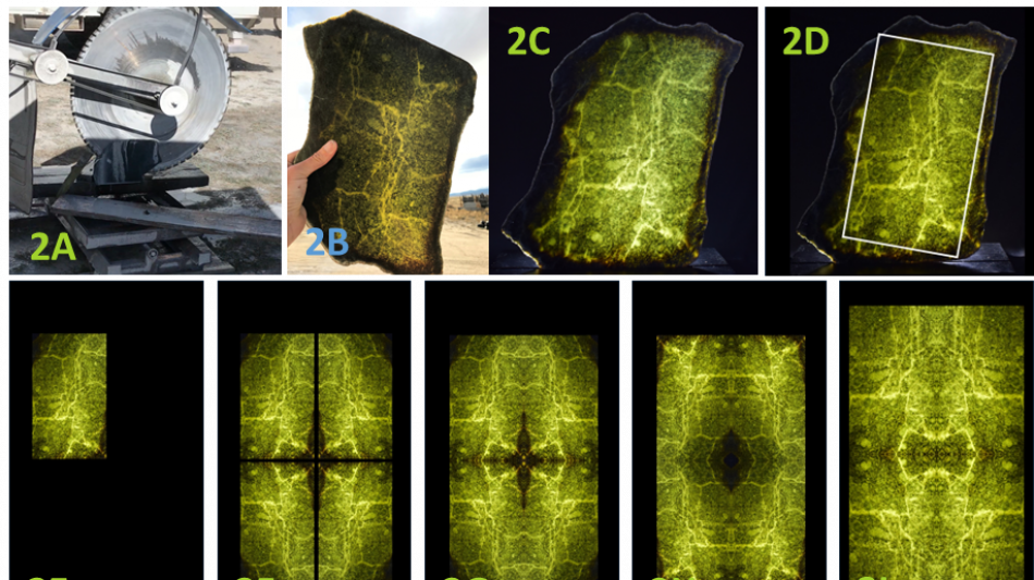 2F: Initial tile image is duplicated for digital modeling and assembly in a digital photomosaic. 2G: A digital prototype assembly of 4 tiles, showing natural patterns emerging from bookmatching techniques with rectangular shapes.