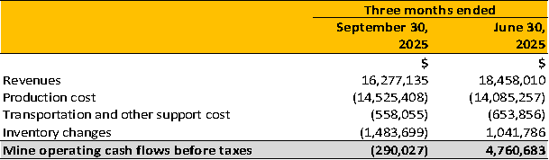 The financial results were as follows for the three months ended September 30, 2025 and June 30, 2025. The Company notes that 44% of the net loss consists of non-cash items, including foreign exchange loss, share-based compensation, and loss on derivatives stemming from the Company's sole outstanding loan.