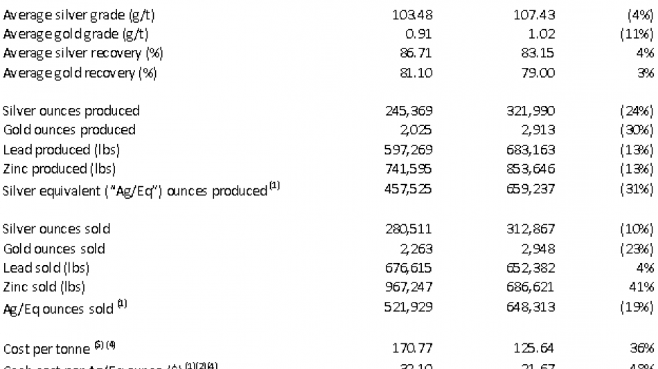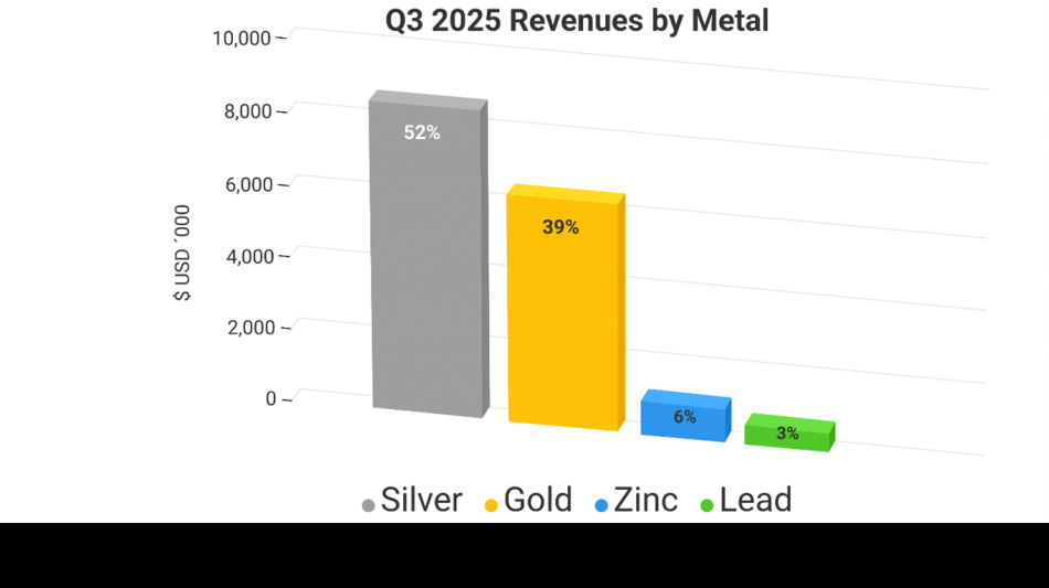Production for the quarter of 457,525 silver-equivalent ounces (AgEq) comprising 245,369 ounces of silver, 2,025 ounces of gold, 597,269 pounds of lead and 741,595 pounds of zinc. Silver equivalents are calculated using an 87.70:1 (Ag/Au), 0.02:1 (Ag/Pb) and 0.03:1 (Ag/Zn) ratio for Q3 2025.